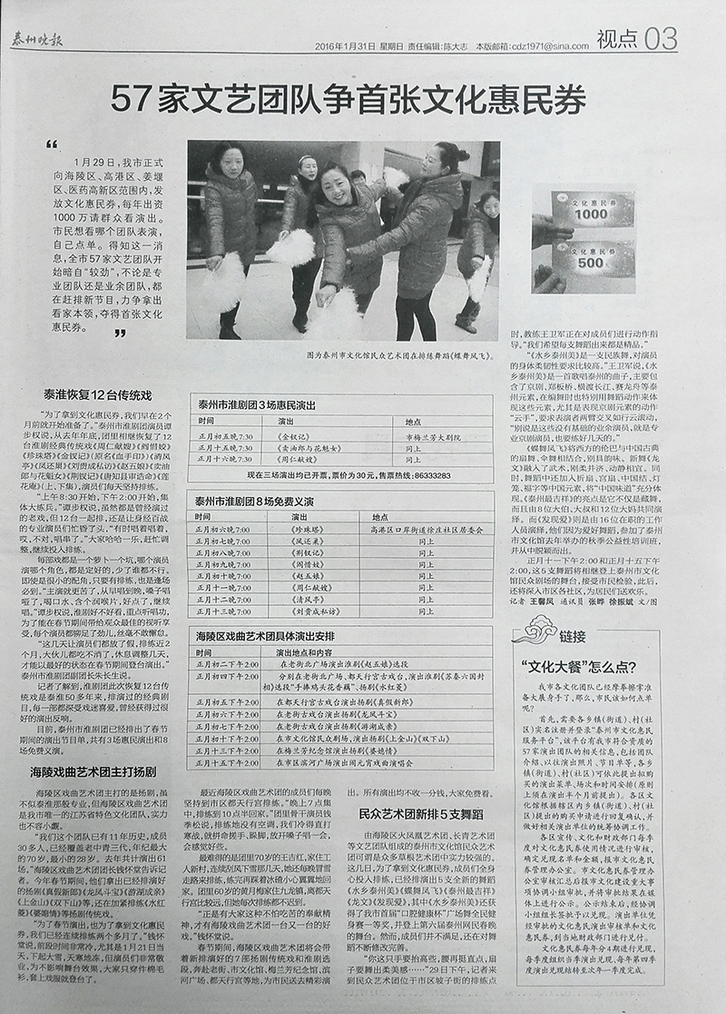 发布时间: 2016/2/1 15:50:00 被阅览数: 2316 次 来源: 泰州文化惠民服务平台