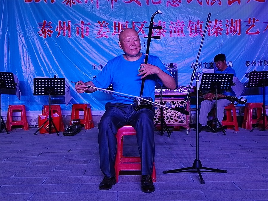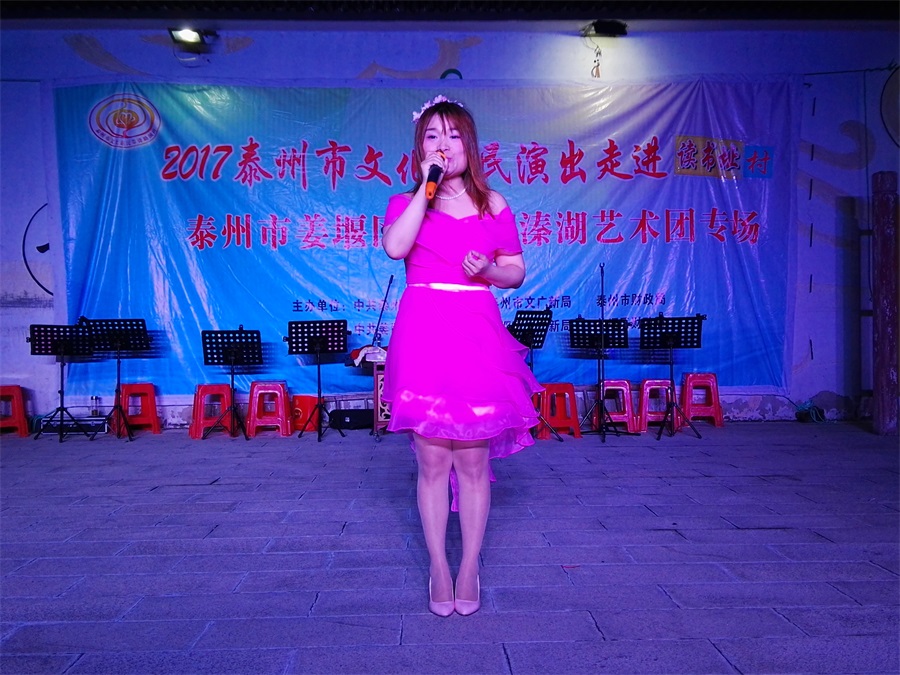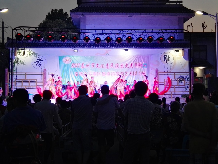 7月10日,姜堰区溱潼镇溱湖艺术团应溱潼镇读书址村邀请,2017年泰州市文化惠民券专场演出于当晚7点三十,在读书村址村百姓大舞台上演。为适应观众不同层次的文化欣赏需求,溱湖艺术团精心策划了16个丰富多彩的文艺节目,随着欢快喜庆的音乐响起,舞蹈《红红火火大中华》拉开了演出序幕,当晚演出不仅有激情奔放的民歌与民舞,还有童星,而且有耳熟能详的戏曲,淮剧《手捧枝头花香藕》,还缴请当地群众上台表演,最后在舞蹈《走向复兴》结束晚会,整台演出效果好,弘扬社会正气,倡导诚实守信,气氛热烈,掌声不断,赢得了广大观众的一致好评。当天晚上演出时长100分钟,观众达到500多人,优美而精彩的表演,给读书址村民送去一份丰盛的文化大餐。