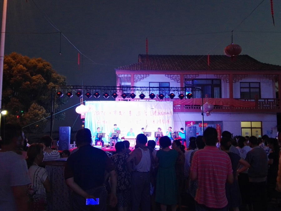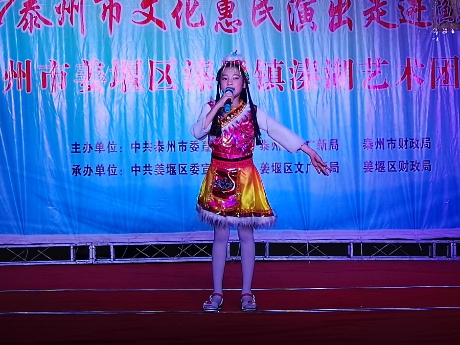 7月11日,姜堰区溱潼镇溱湖艺术团应溱潼镇渔花池社区邀请,2017年泰州市文化惠民券专场演出于当晚7点三十,在社区广场上演。团队专门搭建了大舞台,为适应观众不同层次的文化欣赏需求,溱湖艺术团精心策划了16个丰富多彩的文艺节目,随着欢快喜庆的音乐响起,舞蹈《红红火火大中华》拉开了演出序幕,当晚演出不仅有激情奔放的民歌与民舞,还有童星,而且有耳熟能详的戏曲,淮剧《手捧枝头花香藕》,还缴请当地群众上台表演,最后在舞蹈《走向复兴》结束晚会,整台演出效果好,弘扬社会正气,倡导诚实守信,气氛热烈,掌声不断,赢得了广大观众的一致好评。当天晚上演出时长100分钟,观众达到500多人,优美而精彩的表演,给社区居民送去一份丰盛的文化大餐。