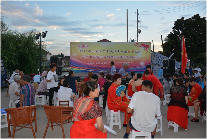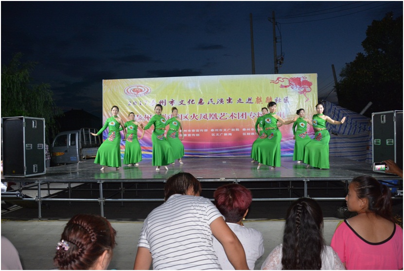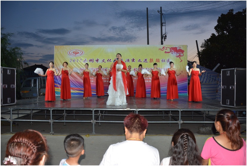 初伏的夏晚,知了声声入耳,火凤凰艺术团在台上的节目更是劲歌热舞,陆续赶来看演出的台下观众人头攒动、过路的车子也排起了长龙.有的观众竞忘了扇子功能,只见他们在兴高采烈地喝彩,掌声、喝彩声、歌声一片沸腾!歌舞让乡村的空气如同陈酿开瓶,醇香扑鼻,沁入肺腑……那些带着扇、扛着凳的、牵老带幼观众越来越多…高潮时,社区领导也登台一曲高歌秀美、更是响彻着麒麟的夜空!