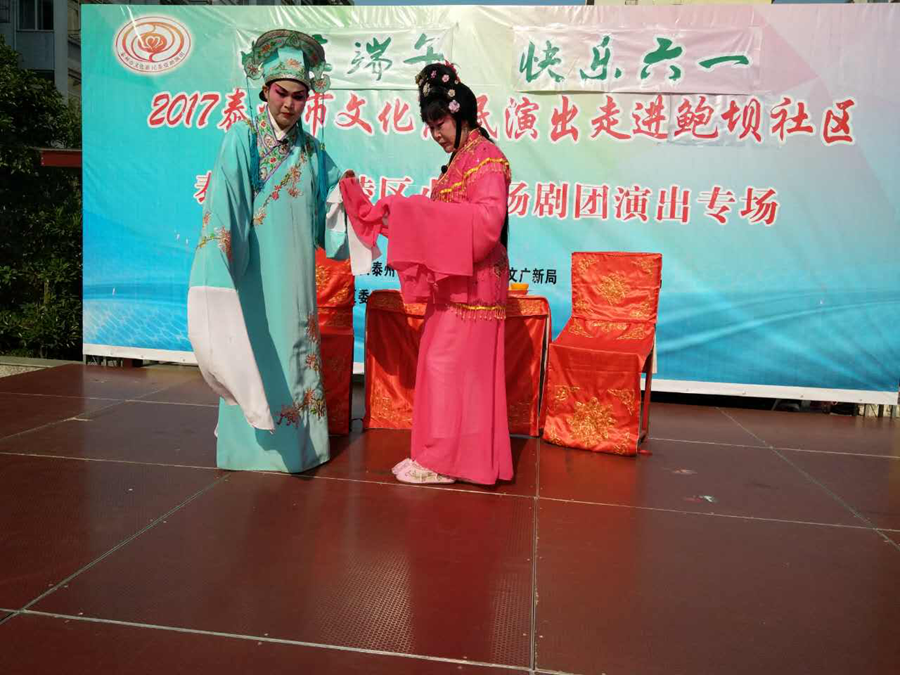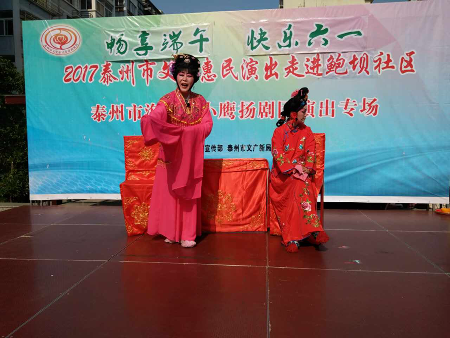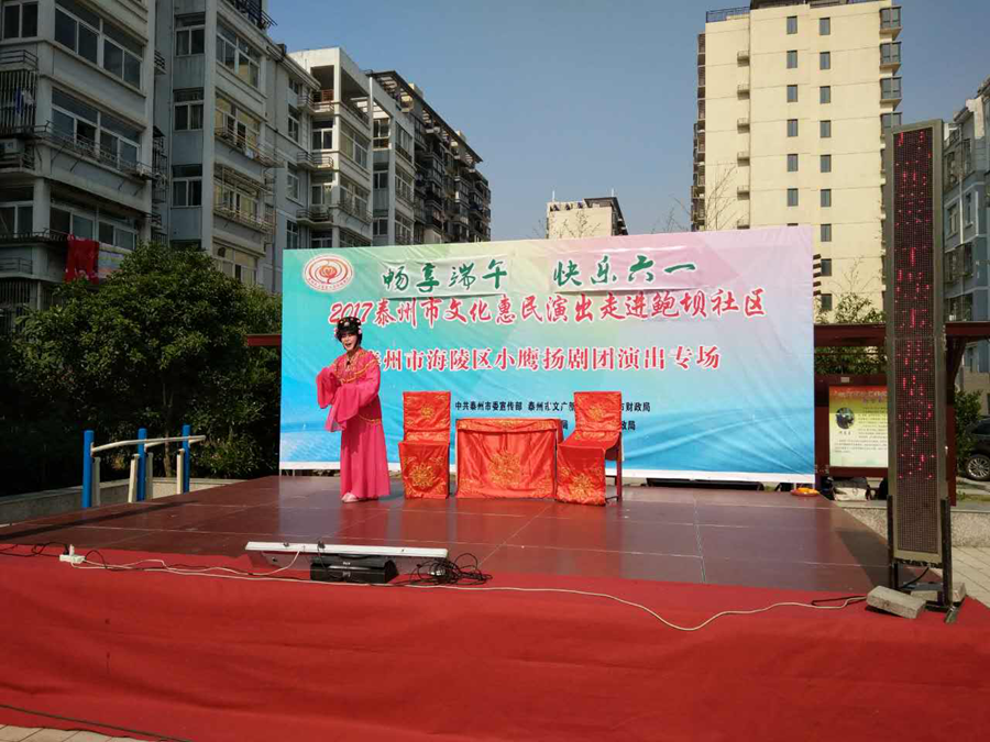 2017泰州市文化惠民演出走进海陵区城东街道鲍坝社区,海陵区小鹰扬剧团专场演出,2017年5月27日晚上在海陵区城东街道鲍坝社区美德善行广场成功举办。经典的扬剧折子戏博得了观众的阵阵掌声。演出很成功!感谢社区领导提供全方位的服务!