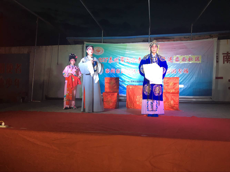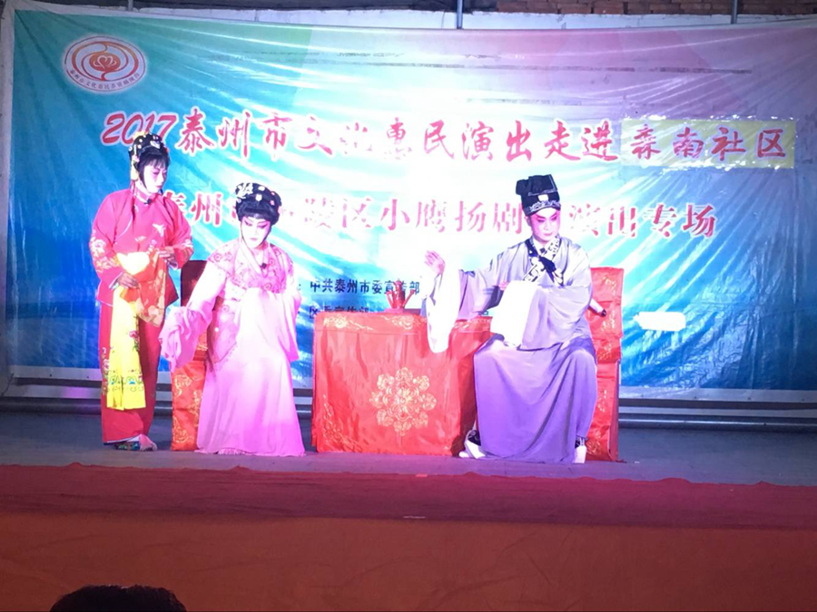 2017泰州市文化惠民演出走进海陵区城西街道森南社区,海陵区小鹰扬剧团专场演出,2017年7月14日晚上在海陵区城西街道森南社区百姓大舞台成功举办。本场演出剧目为传统扬剧整本戏《珍珠塔》。演员们精彩的演唱博得了观众的阵阵掌声。虽然气温很高,但是丝毫没有减弱戏迷们看扬剧的热情!演出很成功!感谢社区领导提供全方位的服务!