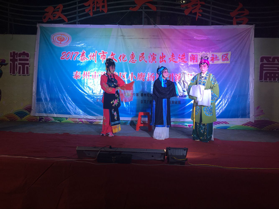 2017泰州市文化惠民演出走进海陵区城西街道闸南社区,海陵区小鹰扬剧团专场演出,2017年7月4日晚上在海陵区城西街道闸南社区百姓大舞台成功举办。经典的扬剧折子戏博得了观众的阵阵掌声。演出很成功!感谢社区领导提供全方位的服务!