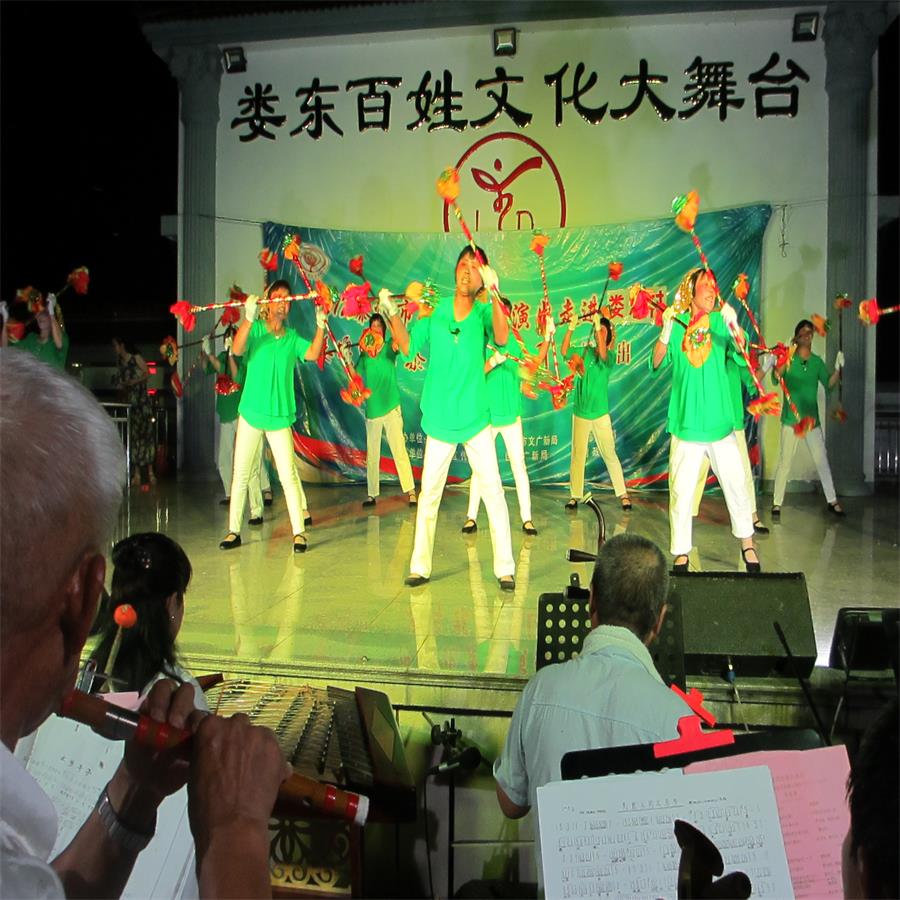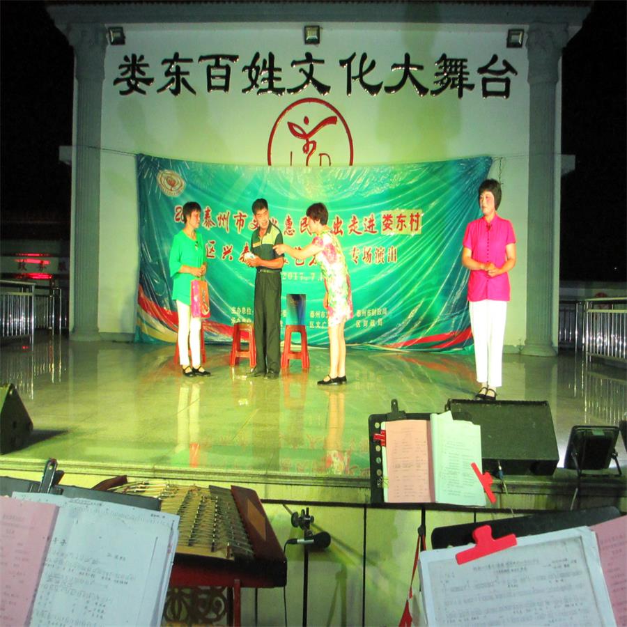 7月15日,夕阳的余辉还挂在天边,娄东村的村民们已早早地聚集在村部百姓大舞台前,等候观看兴泰草根艺术团带来的文化惠民专场演出。晚上七点刚过,欢快热烈的开场器乐合奏拉开了演出帷幕。艺术团给观众带来了多种形式的文艺节目,歌舞声声传递着满满的正能量,小品、说唱歌颂了时代新风,号子、莲湘展示了水乡风情,戏曲表演给人们带来了传统艺术的享受,场上不断传来观众的笑声和掌声。整场演出100分钟,吸引了近300名观众,受到了一致好评。