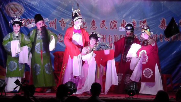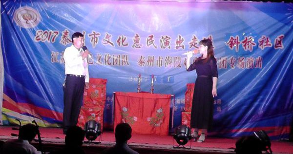 泰州市海陵戏曲艺术团于2017年7月1日晚7时30分在城东街道斜桥社区广场演出大型优秀传统扬剧——《碧玉簪》。我团参演人员25人。由于斜桥社区积极宣传,前来看戏的群众100余人,人民需要文化,文化需要人民,演出现场气氛热烈,观众掌声不断,演出圆满成功。这更加激起我们为老百姓排好戏、演好戏、唱好戏。把泰州市文化惠民演出活动锦上添花,更上一层楼。