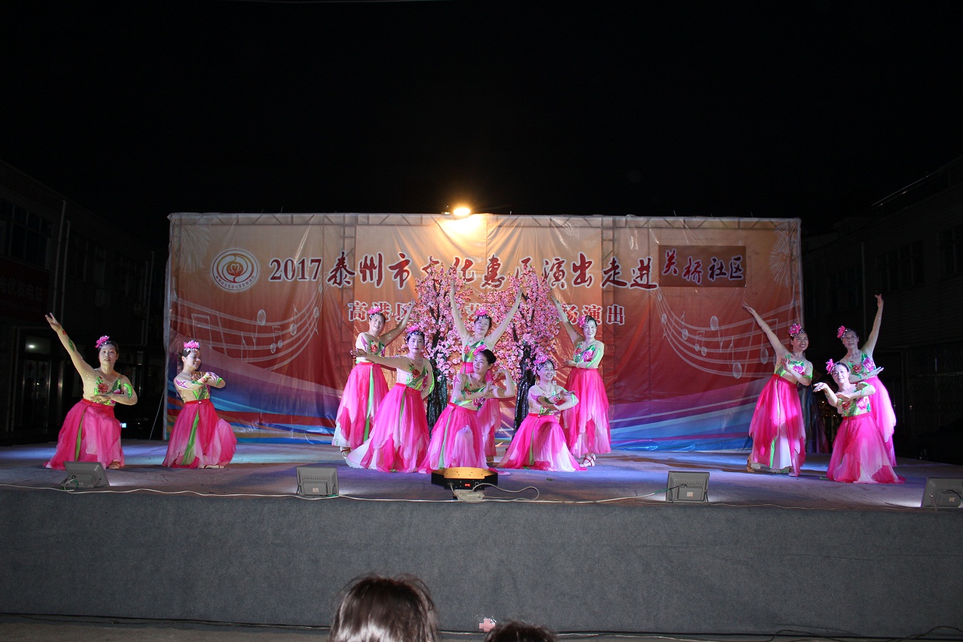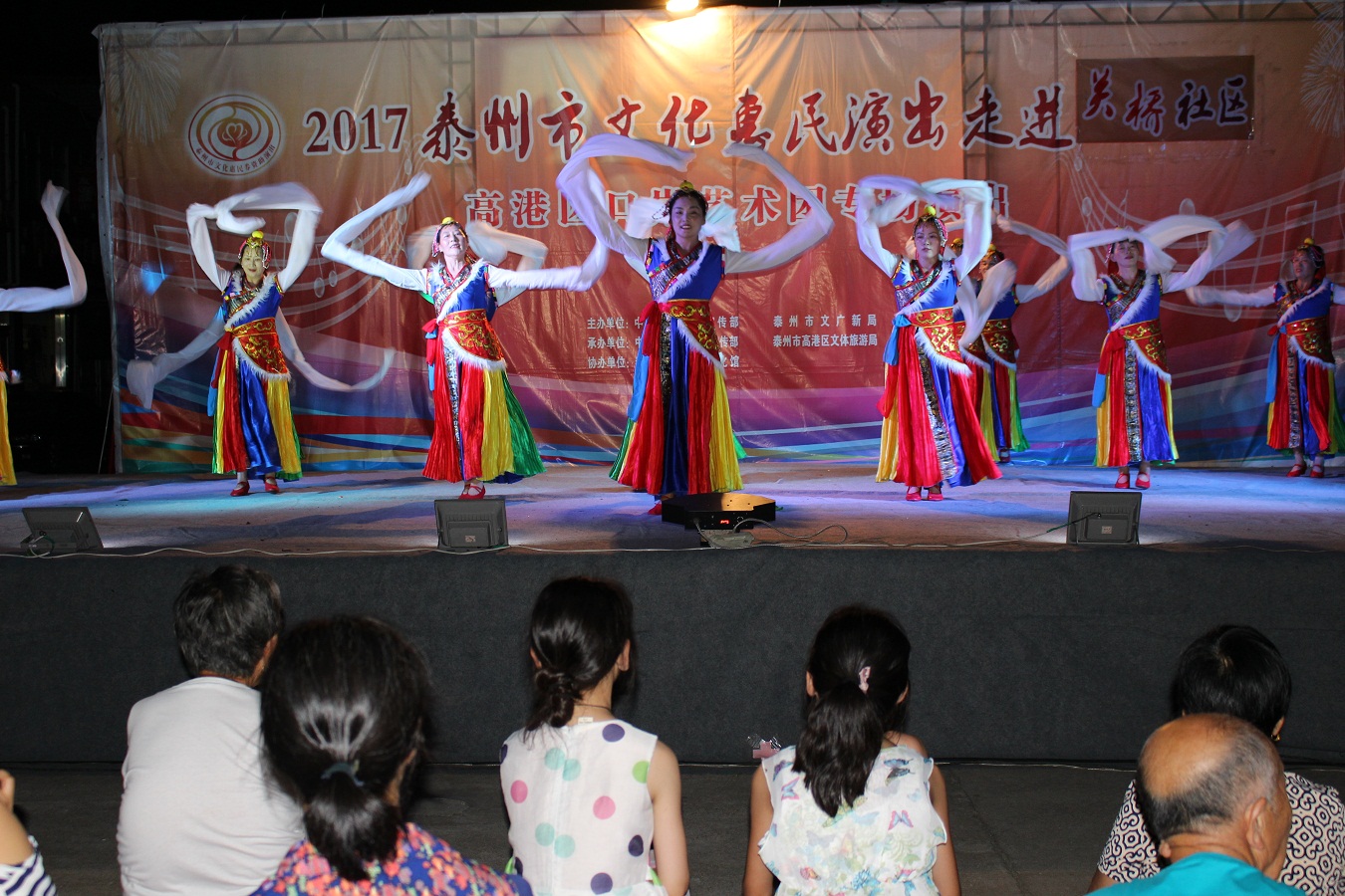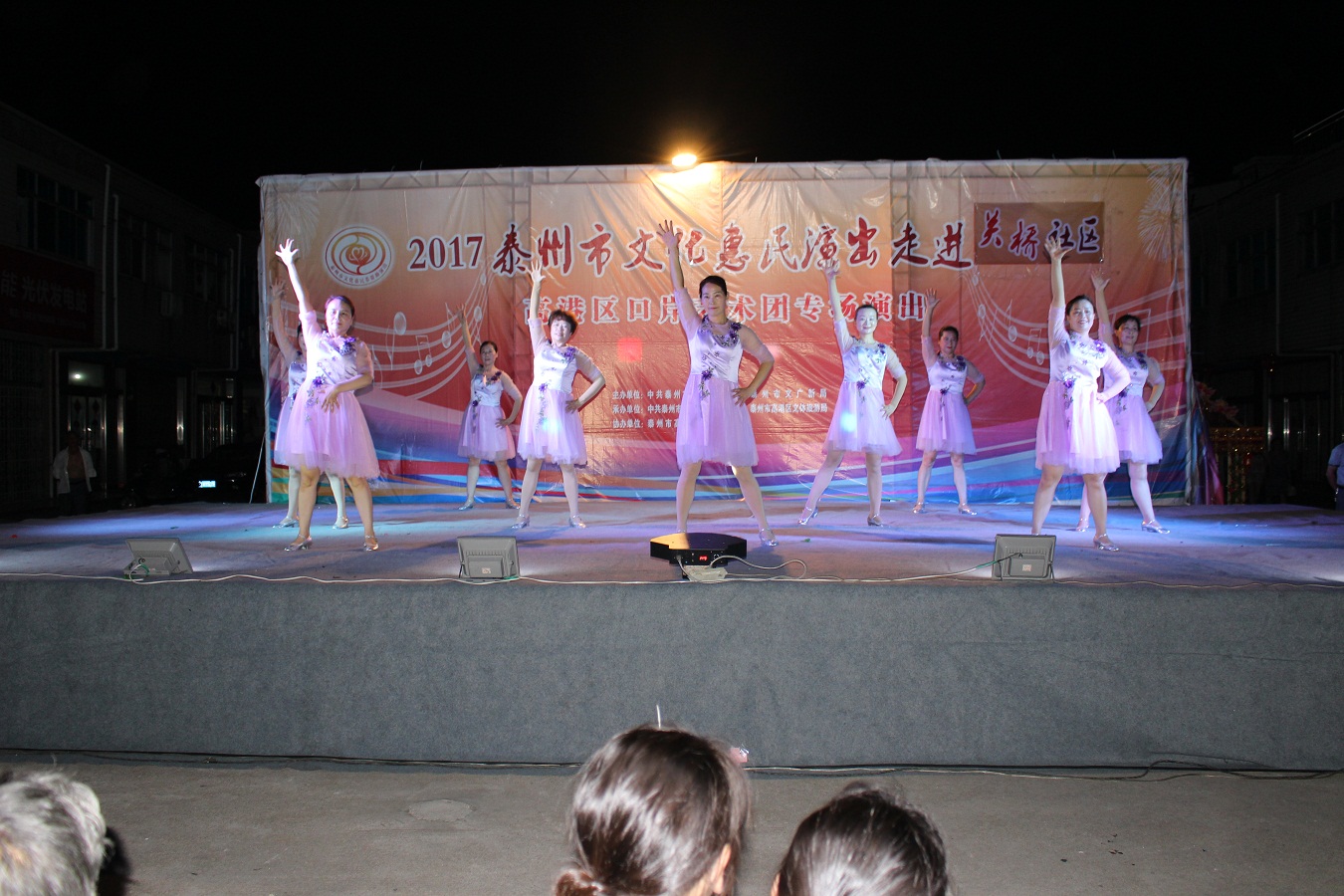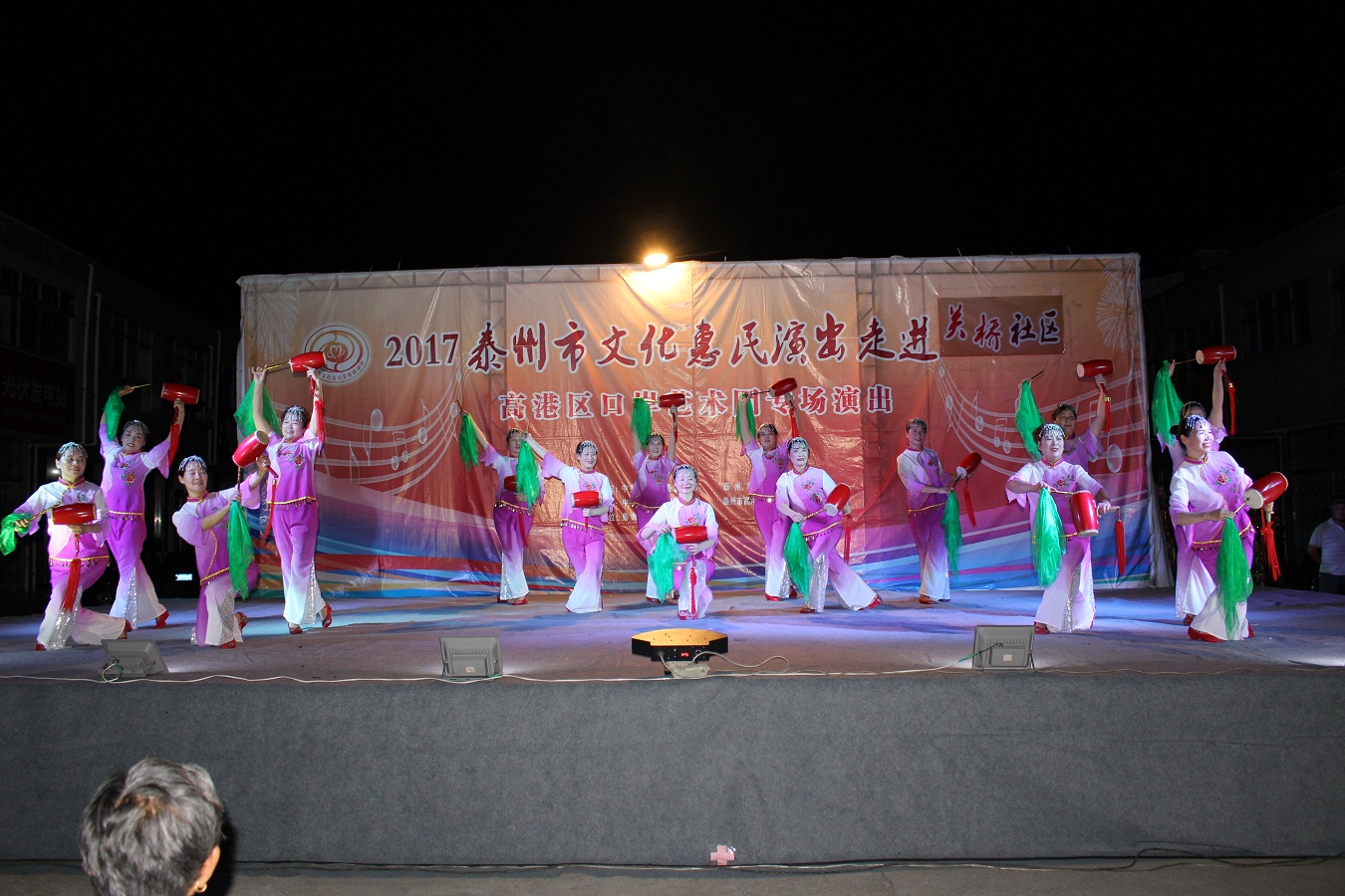 汗水湿透衣背,坚持惠民演出。2017年7月15日晚七点半,泰州市高港区口岸艺术团走进高港区刁铺街道关桥社区,当日是数伏的第四天,白天气温已达36度,傍晚也有31度,每个演员节目演出下来,都是汗流浃背,虽然天气炎热,但演员们的演出热情仍然高涨,动作表演到位。富有浓郁地方特色的文艺节目,吸引了近800名关桥社区居民到体育广场观摩演出。