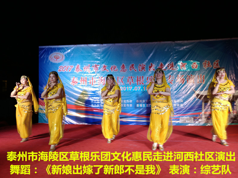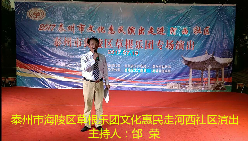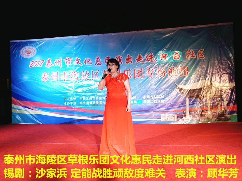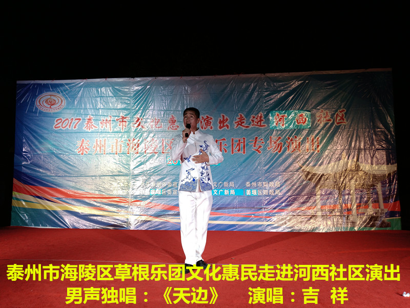 晚上七点2017泰州市文化惠民走进姜堰河西社区——泰州市海陵区草根乐团专场演出正式开始。首先出场的是社区点演的《三个民防谱新篇》节目,这个节目是草根乐团2个月前在江苏省第29届科技月宣传周成功演出的原创节目,居民朋友们用热情的掌声给予赞扬,接着萧独奏、民族舞、现代舞、独唱、对唱、打鼓、快板说唱、京剧表演唱、锡剧等陆续上场,观众们热情非常高,不但掌声如潮、欢呼声不断,还经常现场点节目,我团声乐队队长吉祥的演出观众非常喜欢,以致于完成了演出任务,观众仍不肯下台,主持人解释惠民演出规定不允许同一场一人超过二个节目,可观众强烈要求最后无法拒绝,只好作为非惠民演出正式节目为居民群众表演了他们现场点演节目,满足了居民要求,他们像过年一样的开心,整场节目中草根乐团把市委市政府对老百姓的关爱,把文化惠民的实质精神传递给了社区居民朋友,同时我们得到了社区群众的赞扬,也更加振奋精神,全团上下共同努力,为文化惠民再立新功。