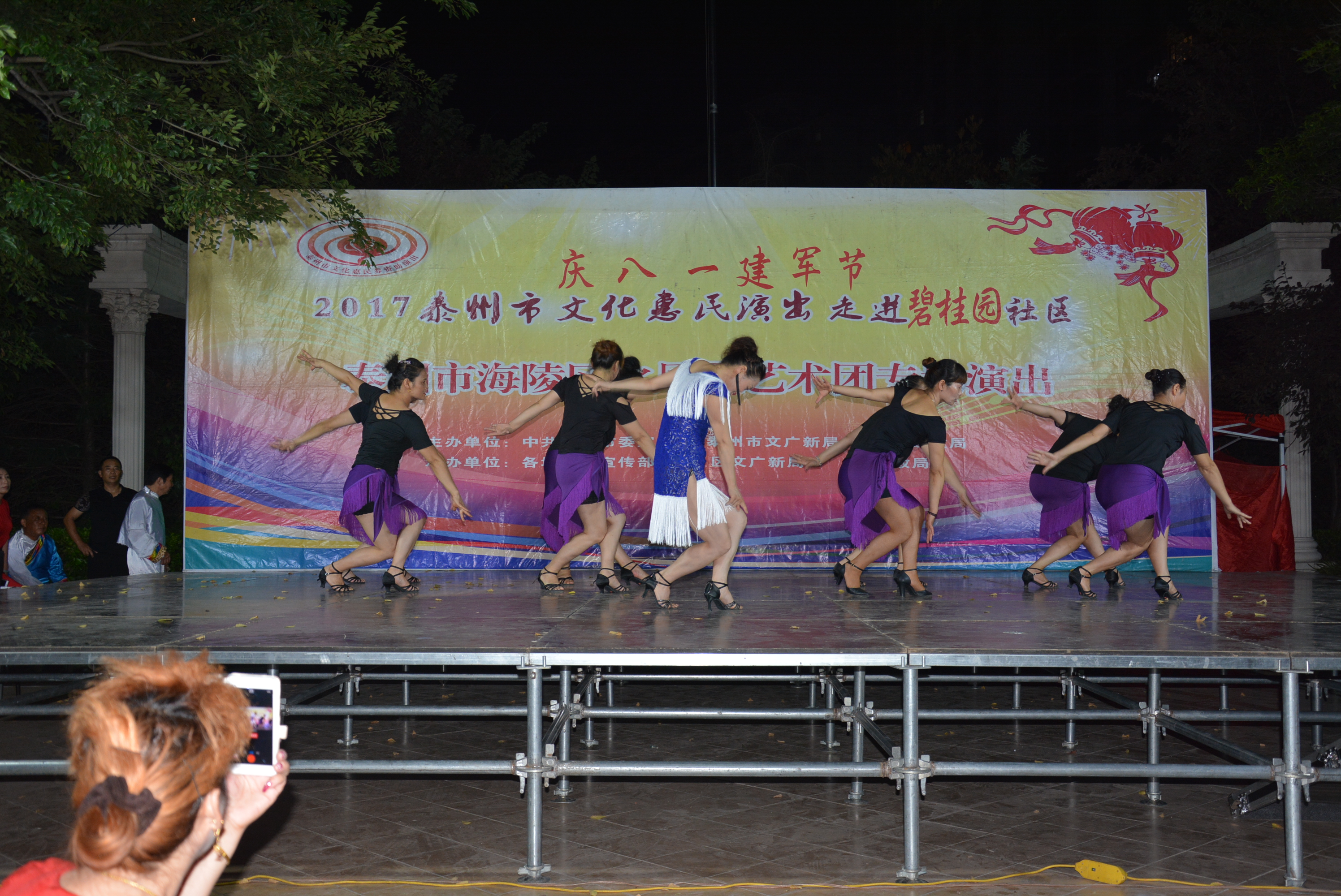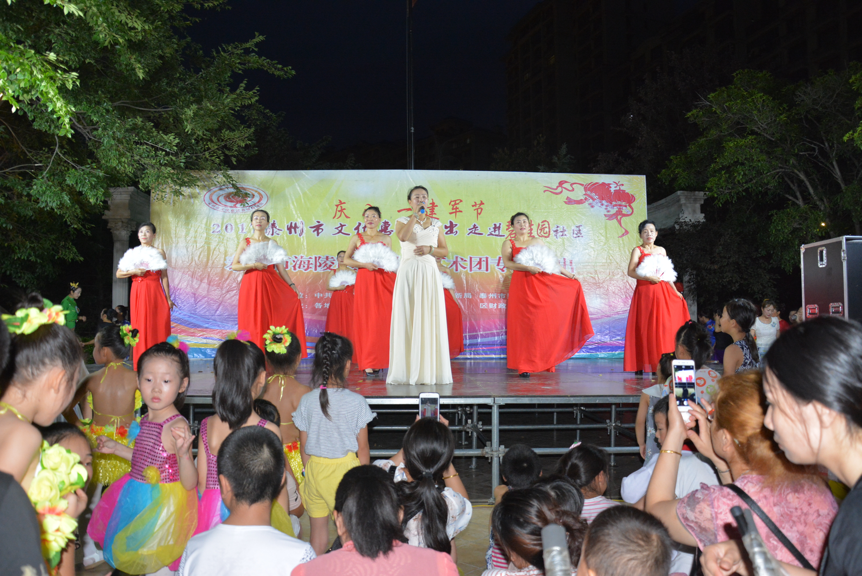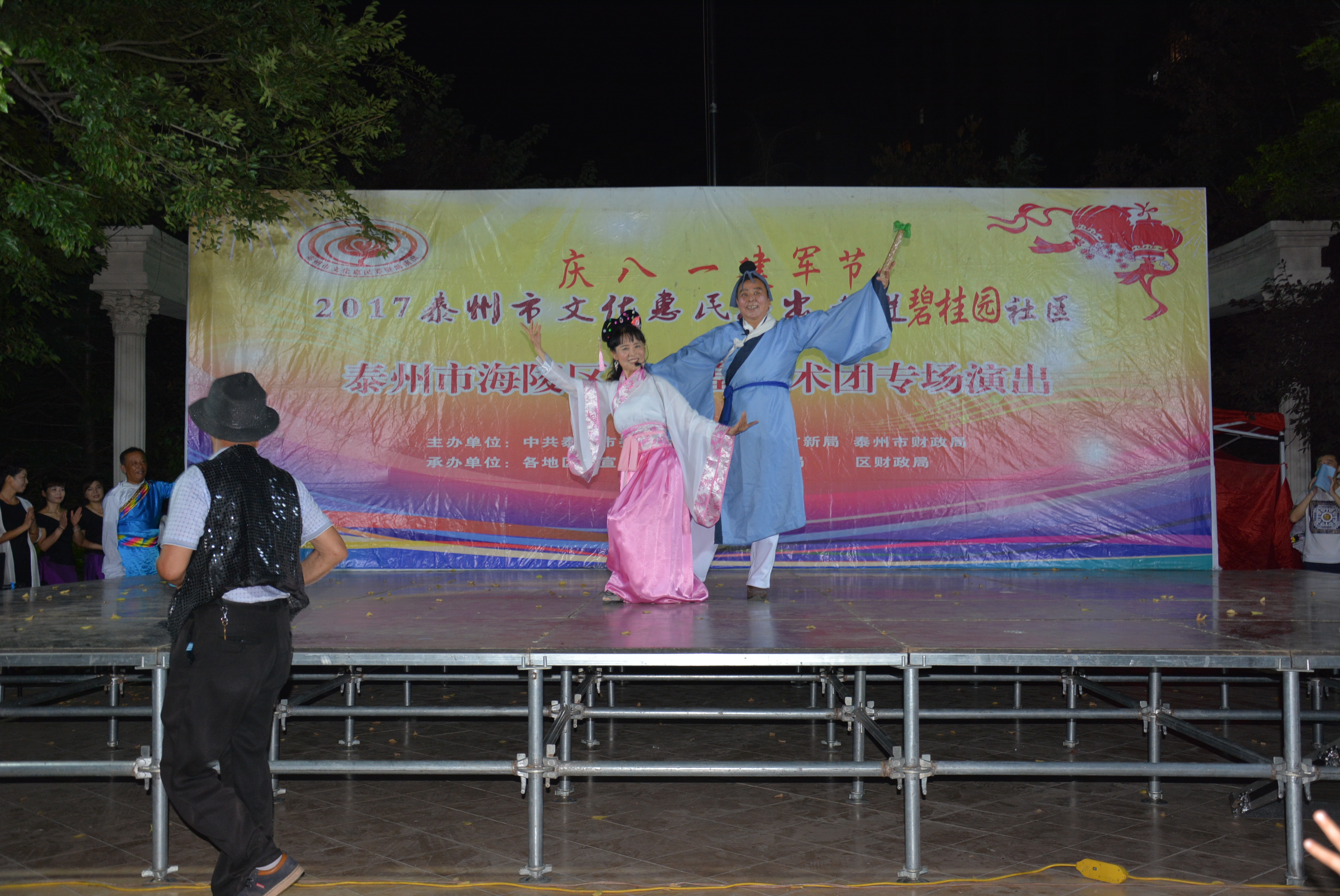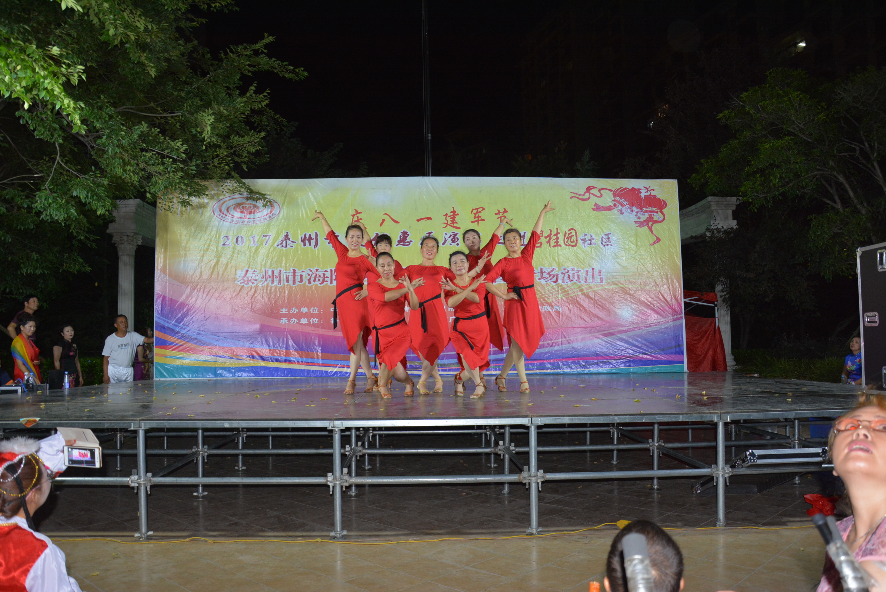 火凤凰艺术团应城东街道碧桂园社区邀请,2017年泰州市文化惠民专场演出于当晚7时30分在碧桂园社区上演。高温、酷暑,听起来就让人畏惧。然而火凤凰艺术团却激情奔放,为适应观众不同层次的文化欣赏需求,突出了庆八一建军节主题,弘扬社会正气,倡导诚实守信,精心策划了16个丰富多彩的文艺节目,随着欢快喜庆的音乐响起, 歌伴舞 《盛世中国美》拉开了演出帷幕,全场演出不仅有激情奔放的舞蹈,而且有耳熟能详的《龙江颂》,演员表演精彩,当天晚上演出碧桂园社区的小朋友也登台献艺,当天晚上演出时长120分钟,观众挤满了演出现场得,优美而精彩的表演给碧桂园社区居民送上一份丰盛的文化大餐。这种人民需要文化,文化在人民中间生根开花的演出,深深的赢得了观众的好评,在高温、酷暑的日子里,压台歌舞 《难忘今宵》,今宵的演出,观众们难以忘记…