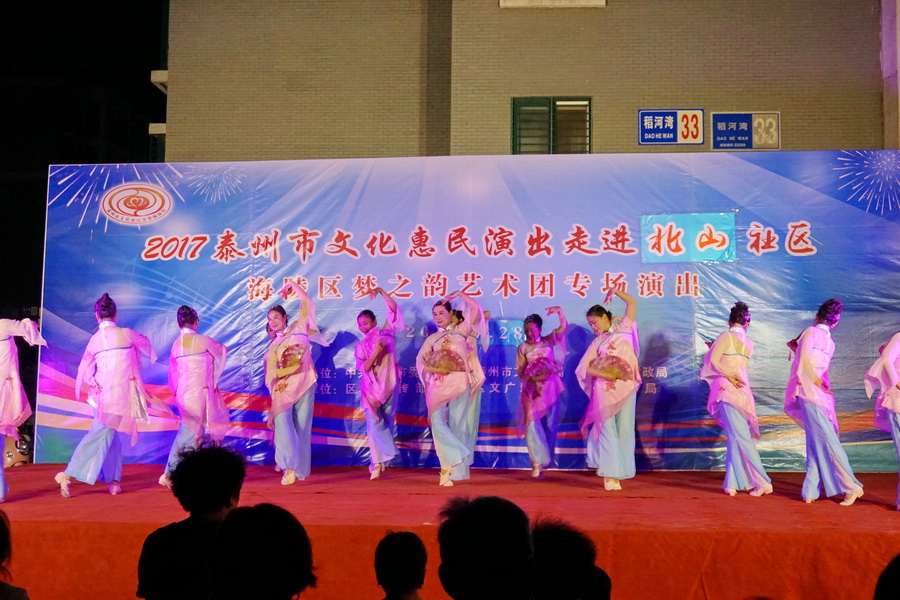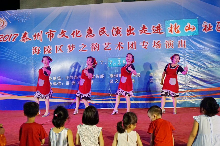 2017年7月28日傍晚,位于城北的稻河湾小区中心广场流光溢彩,歌舞升平,欢歌笑语......,应城北街道北山社区邀请,海陵区梦之韵艺术团走进北山社区,为社区居民带来一场精彩纷呈的纳凉文艺晚会。为纪念临近的八一建军90周年,新排的舞蹈《妻子》以柔美的肢体语言真情再现了军人为国家舍小家的无私奉献精神,为带给暑期的孩子们特别的问候,天真可爱的少儿舞蹈《游子吟》博得现场小观众们的欢呼雀跃.....。演出结束了,不少观众仍余兴未尽,尤其是迟来的观众连声感叹遗憾没有看到全部节目,并一再追问何时再来.....。120分钟的盛情演出,为炎炎夏日中的社区居民带来了一丝清凉和愉悦。