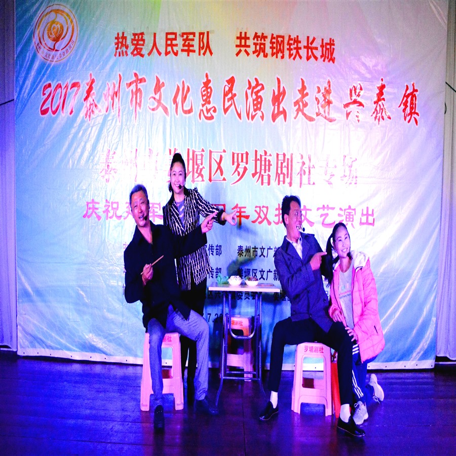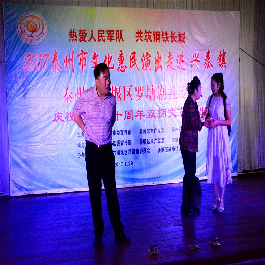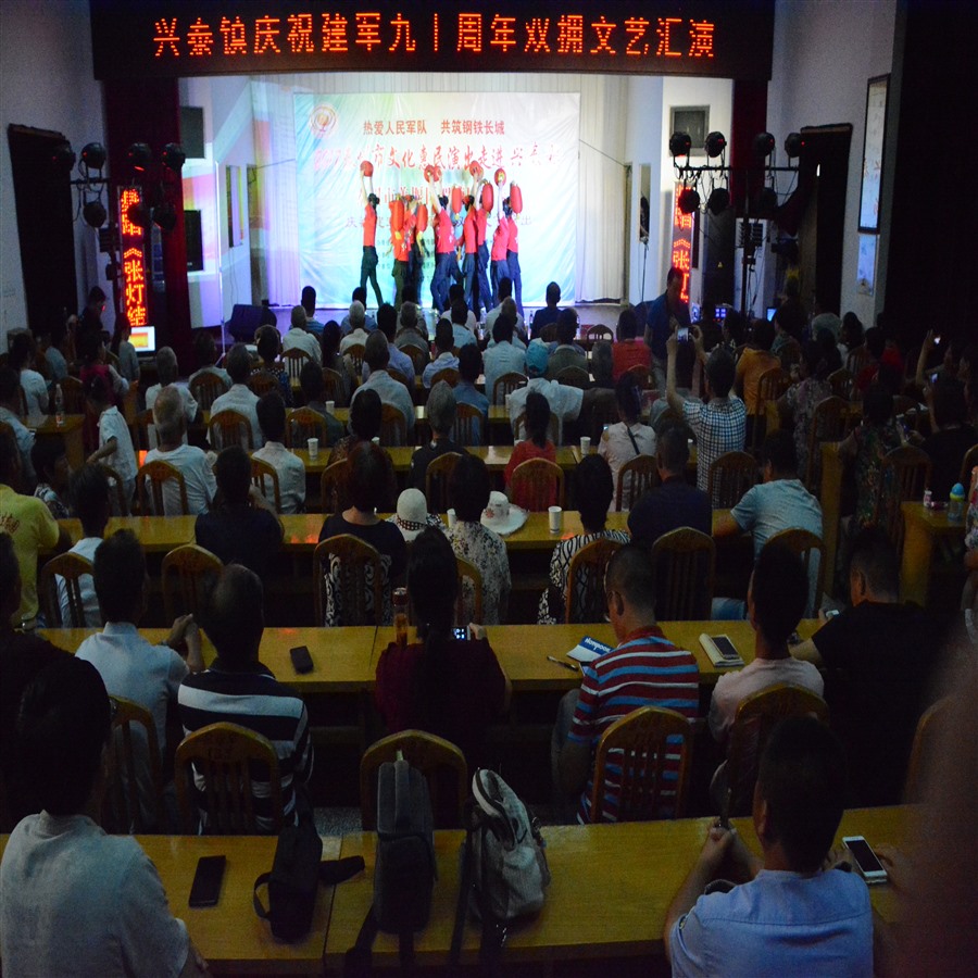 热爱人民军队,共筑钢铁长城。7月29日上午9时,由泰州市姜堰区兴泰镇党委、政府主办,姜堰区罗塘剧社协办《庆祝建军九十周年双拥文艺演出》活动,在兴泰镇政府会议厅拉开帷幕,演出前,姜堰区民政局领导到场讲话,现场播放兴泰镇双拥工作先进亊迹短片,区、镇两级领导分别为重点优抚对象、贫困优抚对象、现役军人家属代表颁发慰问金和奖品。为突出庆祝建军九十周年宣传主题,姜堰区罗塘剧社精心策划调整了14个丰富多彩的文艺节目,安排创作人员重新编写节目主持词,当天演出不仅有激情奔放的民歌与民舞,而且有耳熟能详的戏曲与小品,压台小戏淮剧《父还子债》,该剧根据笫五届感动泰州·美德善行十大人物,姜堰区张甸镇农民李开诚为死去的儿子偿还债务的真实故事创作编导,剧情生动感人,演员表演精彩,唱腔催人泪下,剧情主题突出,弘扬社会正气,倡导诚实守信,赢得了现场观众的阵阵掌声。当天演出时长120分钟,观众达到200多人,优美而精彩的表演给兴泰镇人民送去一份丰盛的文化大餐。