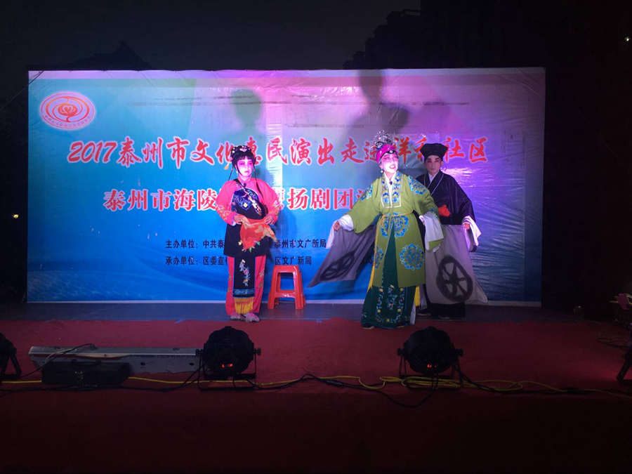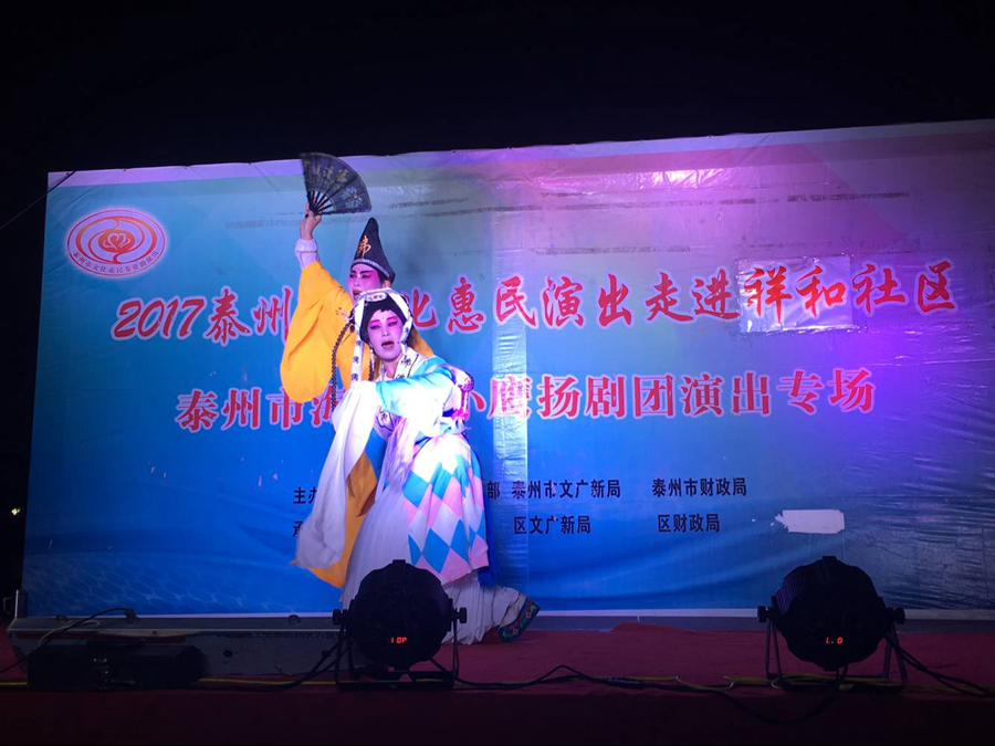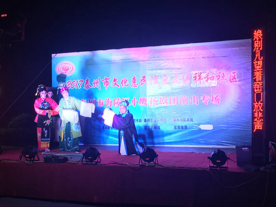 泰州市海陵区小鹰扬剧团于2017年7月31日晚上走进医药高新区寺巷街道祥和社区社区进行文化惠民演出。经典的扬剧折子戏博得了观众的阵阵掌声。演出结束后观众再三要求再加演几段,由此可见扬剧在泰州到处都有扬剧迷。演出很成功!感谢社区领导提供全方位的服务!