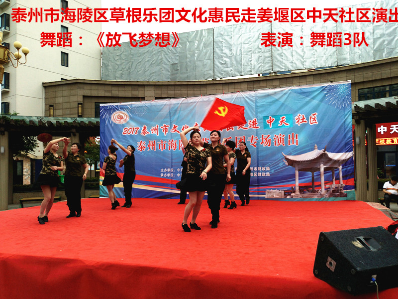 2017年8月4日烈日当空,气温高达39度,地表温度45度,如此高温住在室内的人们都要开着空调、电扇工作或生活,此时在草根乐团却有一股热情比高温天气还高,50多名演职人员从下午一点半开始整理演出用品,在中百一店公交站台集中前往姜堰区罗塘街道中天社区,举办2017泰州市文化惠民走进中天社区草根乐团专场演出!