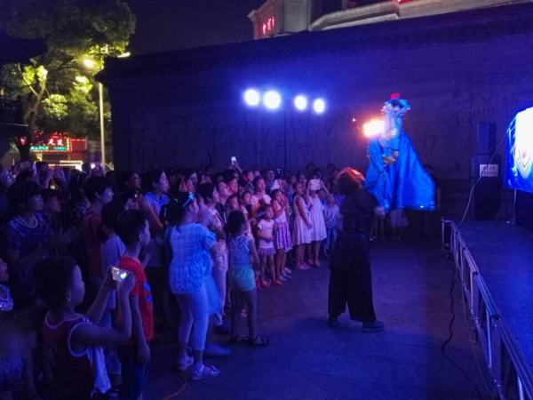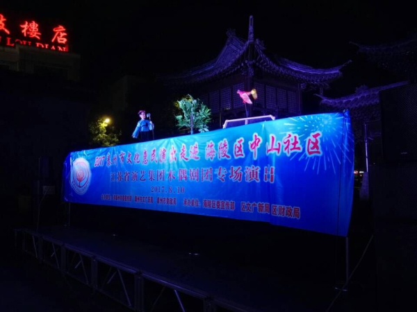 为落实习近平总书记在文艺座谈会上的讲话精神,坚持把社会效益放在首位、实现社会效益和经济效益相统一,积极履行国有文艺院团的社会责任,以实际行动迎接党的十九大胜利召开。8月10日晚7点,由江苏省演艺集团苏演院线演出统筹,省演艺集团木偶剧团积极参与的泰州市文化惠民演出活动在海陵区城中街道中山社区学政试院门口如期举行。