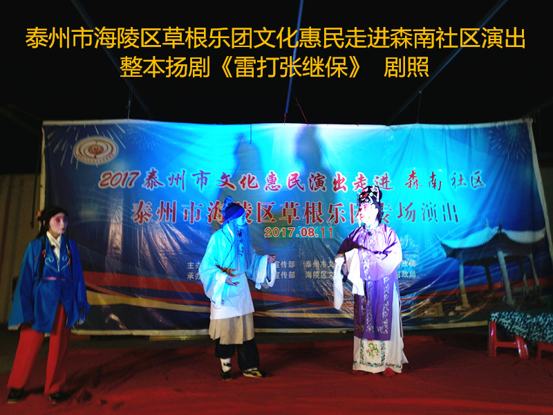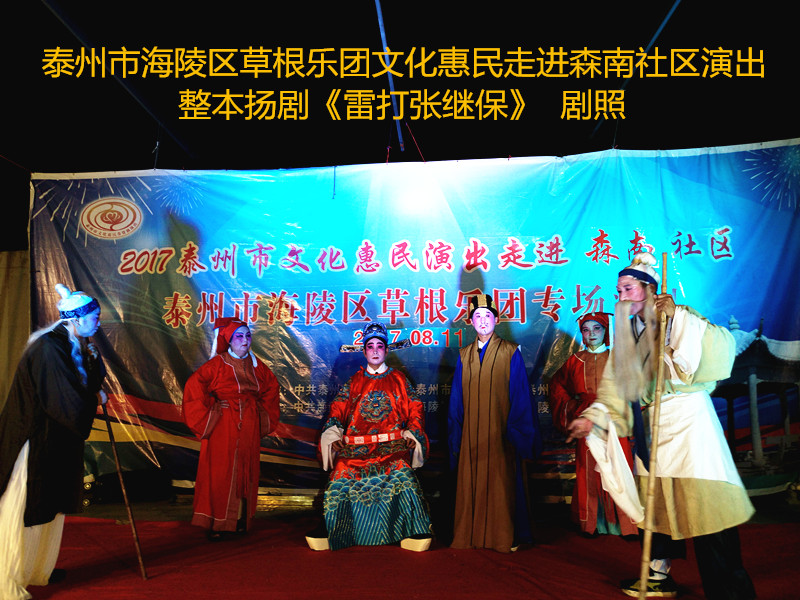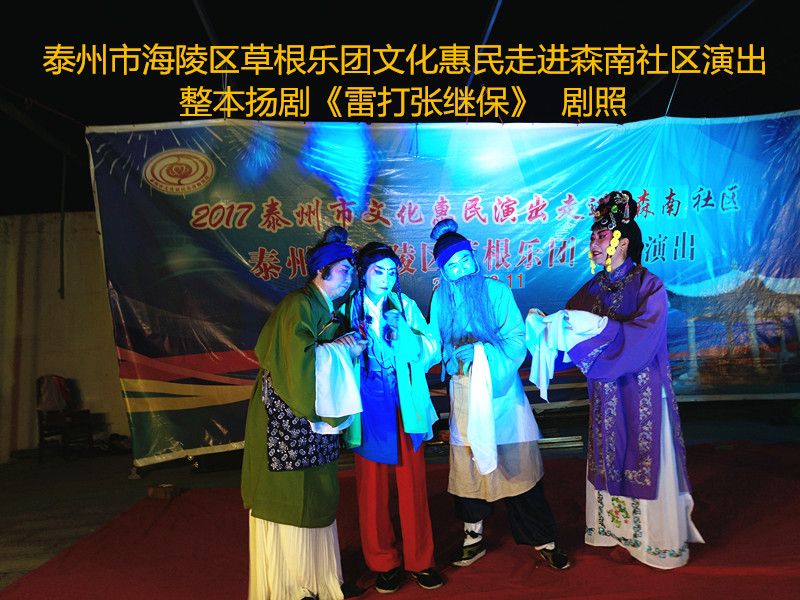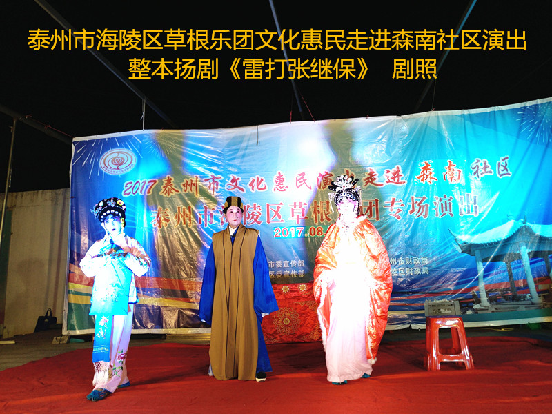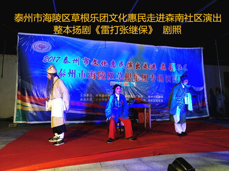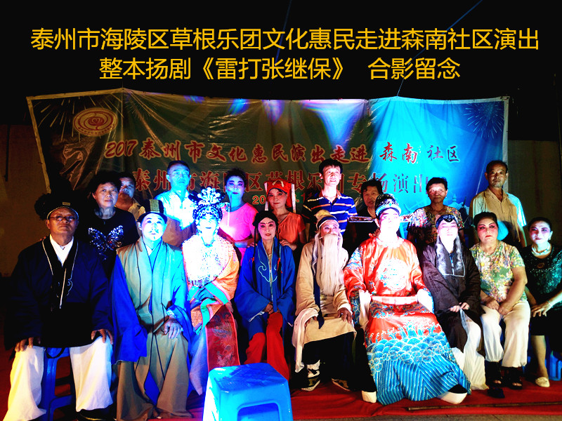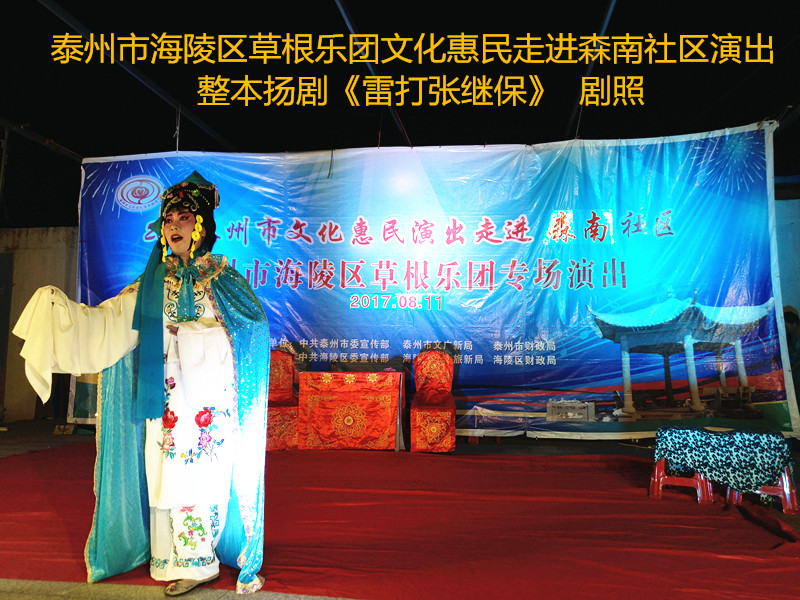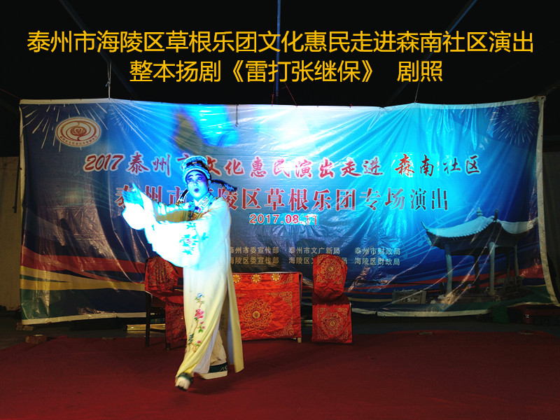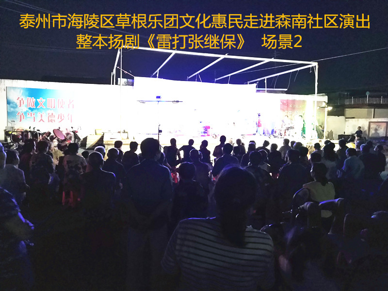 演出现场坐满观众,广场四周还站满了人,清唱了一段《白蛇传》之后,草根乐团戏曲队为社区居民演出了整本扬剧《雷打张继保》,整整三个小时的演出,全体演职人员坚守各自的岗位,尽心尽力演好每一场、做好每个动作、唱好毎一句词、奏好每一个音符。灯光音响字幕为演出效果提供了保障,草根乐团全心全意为观众服务的精神感动了观众;草根乐团的演出水平获得了社区领导和居民朋友的好评。演出过程中观众一阵阵掌声、欢呼声为演员加油!为精彩的节目喝彩!