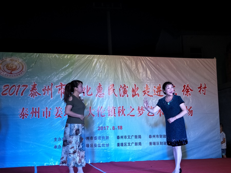 8月18日晚大伦镇秋之梦艺术团,冒着极端的天气,来到大伦镇东徐村进行惠民演出,由于村里面宣传得早,晚上7点不到,老百姓就早早地来到演出现场。惠民演出围绕文明城市创建工作的总体要求和基本内容,艺术团精心编排了十多个节目。有舞蹈,快板,独唱,京胡独奏,方言韵白,方言小品,京剧,锡剧,黄梅戏等精彩片段,演出内容丰富,节目形式多样,现场气氛热烈,观众掌声不断,活动结束后,村干部及老百姓对惠民演出给予了很好的评价和赞赏。