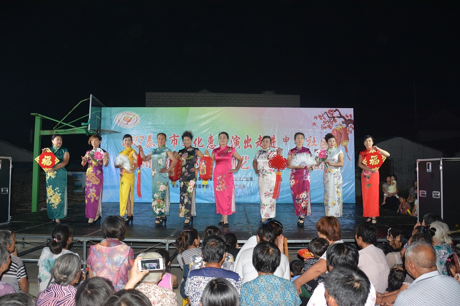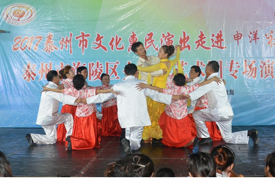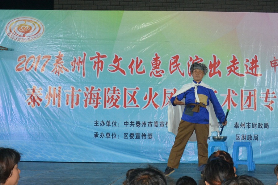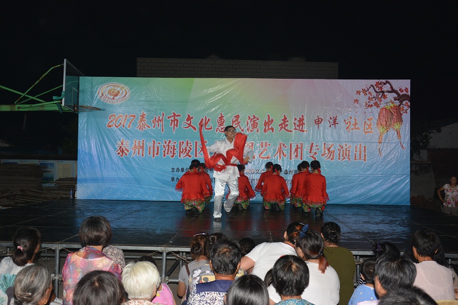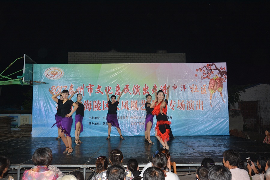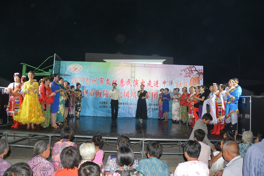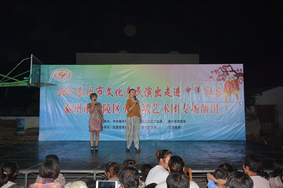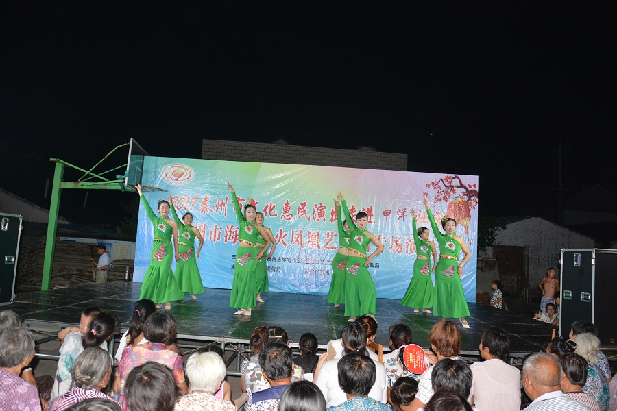 2017年8月20日,天气是阵雨或雷阵雨,不断出现强降水、雷雨大风。火凤凰艺术团面为了完成这次预定的演出任务,下午全体演职人员的克服困难,整理演出用品,准时集结到柳园,然后用了1个多小时时间,完成了近50公里的路程,走进了美丽的姜堰区顾高镇申洋村。因为顾高镇申洋村宣传到位,村民几天前就知道火凤凰艺术团晚上来演出,舞台搭好后,舞台前坐满观众,四周还站满了人。一切准备就绪,7点30分,演出准点开始。演出受到了顾高镇申洋村居民们的热情洋溢的喝彩。火凤凰艺术团经过精心准备16个精彩节目逐个呈现给观众时,中间还临时增加了魔术、独唱、葫芦丝与口琴合奏3个节目,演出中间,顾高镇申洋村社区领导登台为演员献花,小朋友还登台参与节目互动,现场演出热闹无比、掌声不断,整场演出圆满成功。
