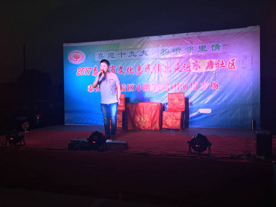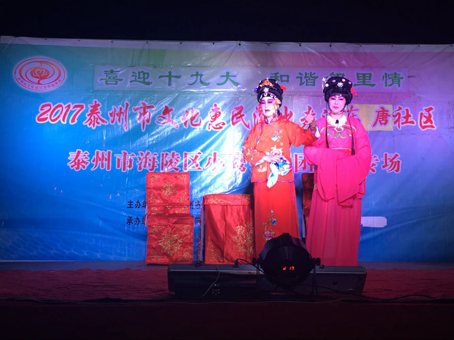 2017泰州市文化惠民演出走进海陵区京泰街道东唐社区,海陵区小鹰扬剧团专场演出,2017年8月13日晚上在海陵区京泰街道东唐十二组停车场成功举办。经典的扬剧折子戏博得了观众的阵阵掌声。演出很成功!感谢社区领导提供全方位的服务!