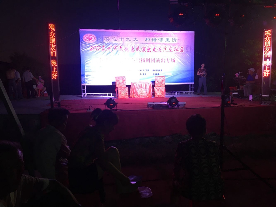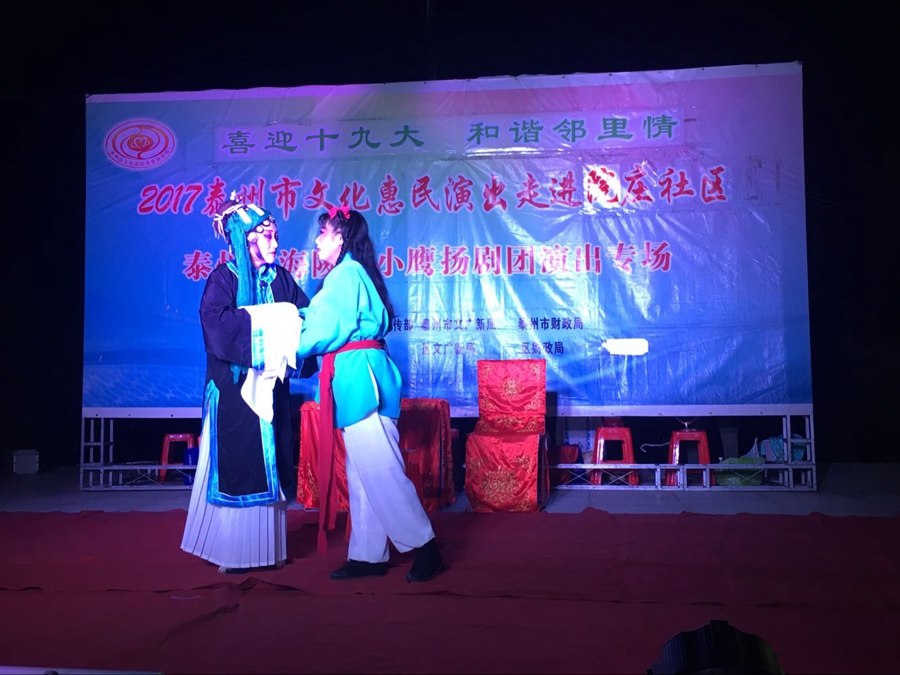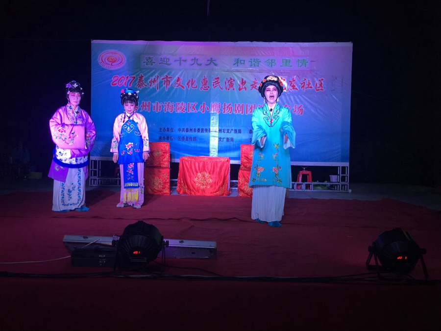 2017泰州市文化惠民演出走进海陵区苏陈镇院庄村,海陵区小鹰扬剧团专场演出,2017年8月23日晚上在海陵区苏陈镇院庄村文化广场社成功举办。本次演出演出剧目为折子戏《赠珠塔》-赠塔,《小媳妇回娘家》、《安寿宝卖身》-母子离别。经典的扬剧折子戏博得了观众的阵阵掌声。演出很成功!感谢社区领导提供全方位的服务!