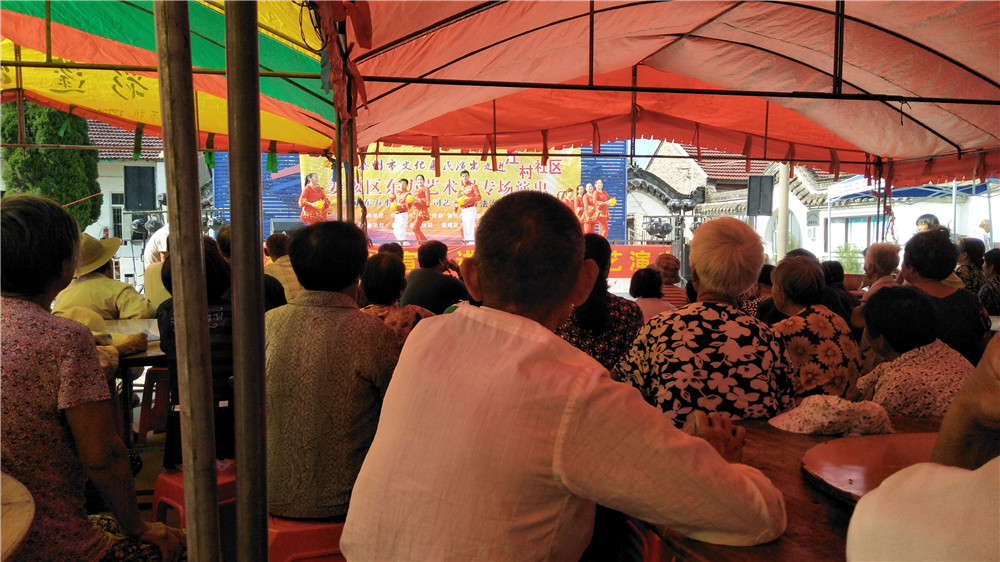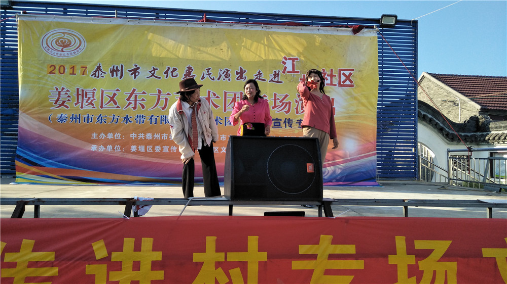 9月1日下午,姜堰区东方艺术团走进梁徐镇江村村,为百姓们带去了精彩纷呈的文艺演出。歌舞《微笑》、歌曲《万水千山总是情》、莲湘舞《红红的中国》、小品《如此媒人》、方言韵白《斗嘴》等精彩节目赢得了观众们的阵阵掌声。