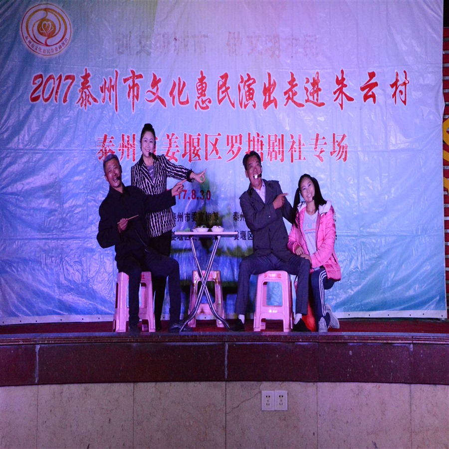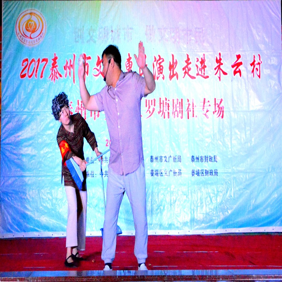 8月30日,姜堰区罗塘剧社应罗塘街道朱云村邀请,2017年泰州市文化惠民券专场演出于当晚6点45分在朱云村百姓大舞台上演。为适应观众不同层次的文化欣赏需求,姜堰区罗塘剧社精心策划了16个丰富多彩的文艺节目,随着欢快喜庆的音乐响起,舞蹈《张灯结彩》拉开了演出序幕,当晚演出不仅有激情奔放的民歌与民舞,而且有耳熟能详的戏曲与小品,压台小戏淮剧《父还子债》,该剧是根据笫五届感动泰州·美德善行十大人物,姜堰区张甸镇农民李开诚为死去的儿子偿还欠债的真实故事创作而编导,剧情生动感人,演员入情入戏,唱腔催人泪下,整台演出效果,弘扬社会正气,倡导诚实守信,气氛热烈,掌声不断,赢得了广大观众的一致好评。当天晚上演出时长120分钟,观众达到200多人,优美而精彩的表演,给朱云村村民送去一份丰盛的文化大餐。
