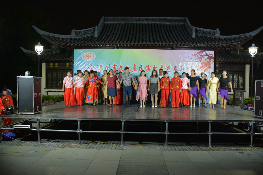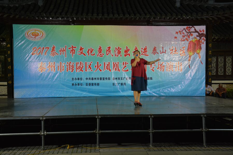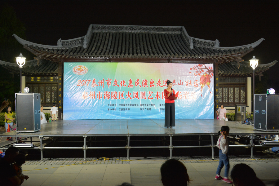 为丰富村民群众的文化生活,营造良好的文化活动氛围,传递文化正能量,2017年9月5日,应海陵区城中街道泰山社区邀请,火凤凰艺术团文化惠民演出走进了泰山社区。演出现场人声鼎沸,火凤凰艺术团文化惠民演出在泰山公园东门拉开帷幕,几百名居民在家门口享受了一场欢乐的文化盛宴。近二个小时的演出,获奖节目《水乡泰州美》、经典的动感《傲慢华尔兹》《黄玫瑰》《路遇》《心中的舞蹈》和传统的《洞房花烛静幽幽》《天女散花》《手心手背都是肉》《白毛女》深深地抓住了在场所有观众的目光,独唱《呼伦贝尔大草原》《北京颂歌》和精彩的舞蹈《燃烧地板》《蝶舞凤飞 》《难忘今宵 》与感人的诗歌朗诵《母亲 》一一登台亮相。演员们塑造的人物鲜活灵动,观众们不时地拿起手机拍照,为演员的精彩表演鼓掌叫好。观众对演出赞不绝口:“火凤凰艺术团这些节目就是演得好啊!看了这么多精彩的节目,让我们感到特别满足和开心!”