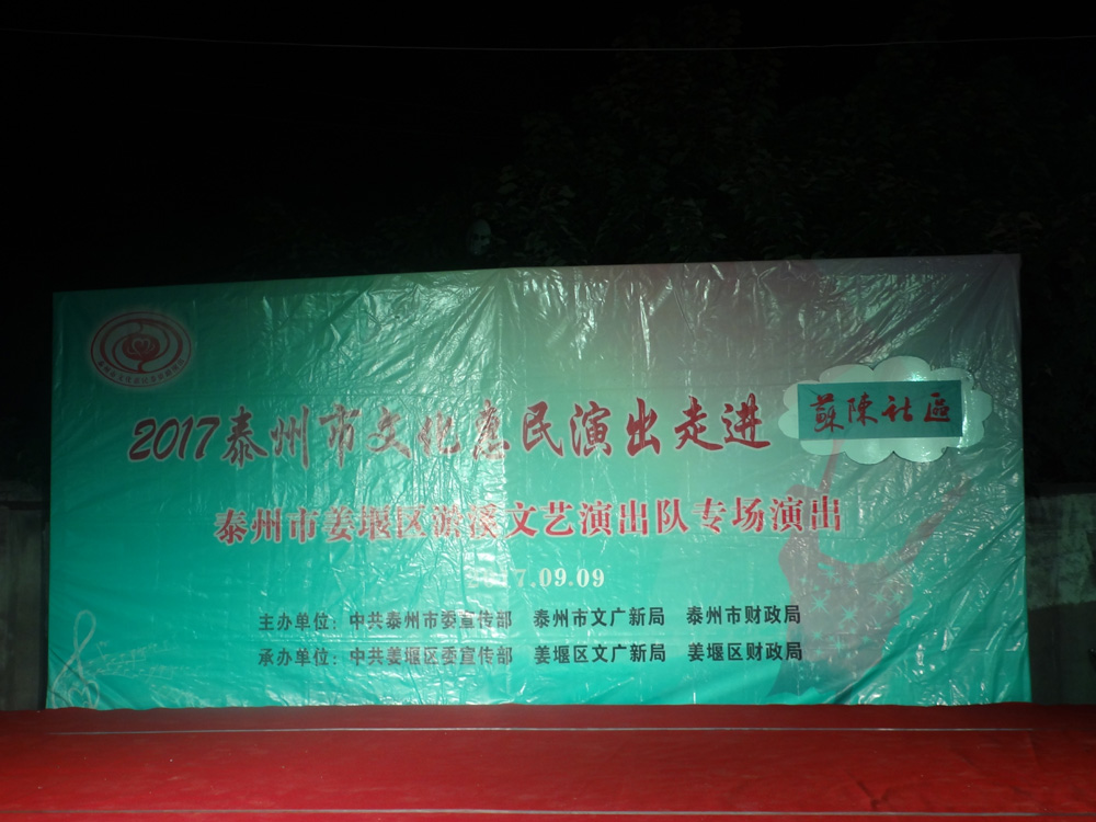 2017年9月9日晚,我们淤溪文艺演出队应邀走进海陵区苏陈镇苏陈社区,为这里的人民献上了一台精彩的文艺晚会,节目内容戏曲,歌舞,小品,表演唱,器乐小合奏,特技表演等,演出生动活泼,精彩纷呈,观众掌声不断,特别是小品《争婆婆》观众笑得合不拢嘴,掌声欢呼声响成一片,整台晚会两个多小时不知不觉就过去了,受